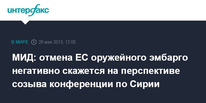 Москва. 28 мая. INTERFAX.RU - Решение Евросоюза отменить эмбарго на поставки оружия сирийской оппозиции может нанести ущерб предстоящей международной конференции по Сирии в Женеве.