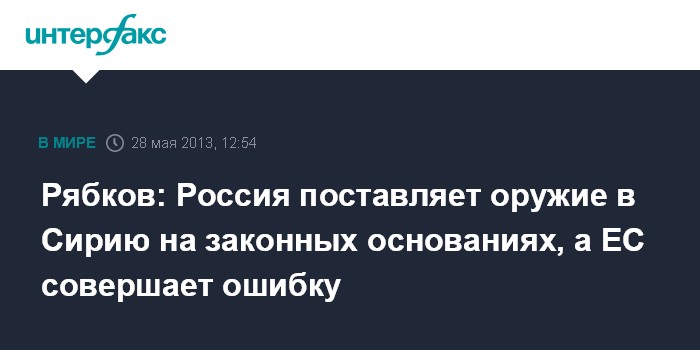 Москва. 28 мая. INTERFAX.RU - Замглавы МИД России Сергей Рябков заявил, что никто не вправе упрекать Россию в поставках оружия в Сирию - оно поступает законным властям этой страны.
