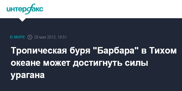 Вашингтон. 29 мая. INTERFAX.RU - Приближающаяся к южному тихоокеанскому побережью Мексики тропическая буря "Барбара" набирает мощность и может достигнуть силы урагана, сообщают в среду в Национальном центре исследования ураганов США.