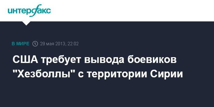 Вашингтон. 29 мая. INTERFAX.RU - США требует вывести боевиков "Хезболлы", участвующих в боях в Сирии стороне правительственной армии, заявила в среду представитель государственного департамента США Дженнифер Псаки.