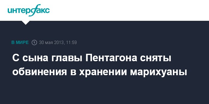 Вашингтон. 30 мая. INTERFAX.RU - Суд американского графства Фэрфакс (штат Вирджиния), снял с 20-летнего сына министра обороны США Чака Хейгела - Зиллера Хейгела обвинение в хранении марихуаны, сообщила в четверг американская газета Washington Post.