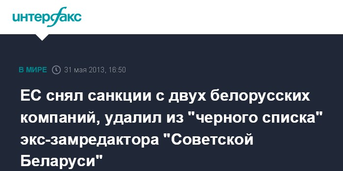 Минск. 31 мая. INTERFAX.RU - Евросоюз отменил санкции в отношении двух белорусских предприятий и бывшего заместителя редактора газеты "Советская Беларусь". Данное решение опубликовано в официальном издании Евросоюза Eur-Lex.