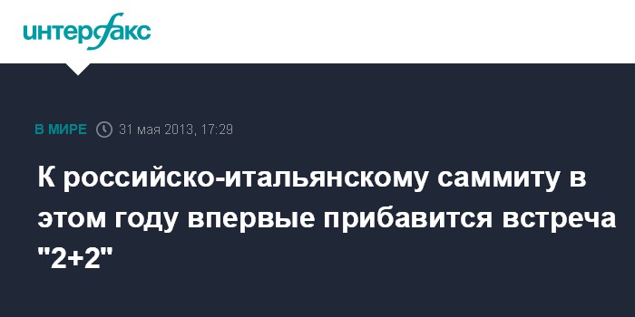 Москва. 31 мая. INTERFAX.RU - На осень этого года запланирована итальянско-российская встреча в верхах, а уже в ближайшие месяцы может впервые состояться встреча в формате "2+2" на уровне глав МИД и Минобороны двух стран.