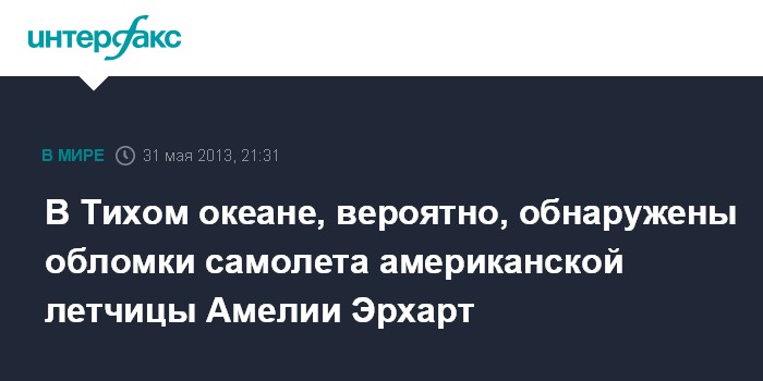 Вашингтон. 31 мая. INTERFAX.RU - Международной группе по поиску исторических самолетов, возможно, удалось обнаружить обломки самолета американской женщины-пилота Амелии Эрхарт, пропавшей над Тихим океаном в 1937 году, сообщается на сайте этой организации.