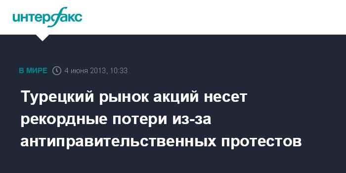 Стамбул. 4 июня. INTERFAX.RU - Турецкий рынок акций упал в понедельник более чем на 10%, национальная валюта подешевела к доллару на 0,7% на фоне продолжающихся уже четыре дня массовых протестов и столкновений полиции с демонстрантами, выступающими, в частности, против исламизации страны.