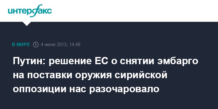 "Мы дали нашу оценку принятого на прошлой неделе министром иностранных дел стран ЕС решения о снятии эмбарго на поставки оружия сирийской оппозиции. Не буду скрывать, нас это разочаровало", - сказал президент России Владимир Путин на пресс-конференции по итогам саммита РФ-ЕС в Екатеринбурге.
