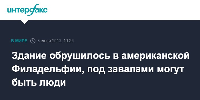 Вашингтон. 5 июня. INTERFAX.RU - Обрушение здания произошло в центре города Филадельфия на востоке США, сообщили в среду журналистам представители местной пожарной службы.