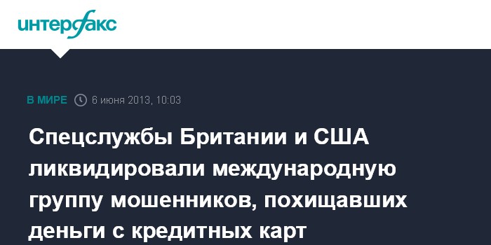 Лондон. 6 июня. INTERFAX.RU - Спецслужбы Великобритании и США задержали в четверг 11 человек, обвиняемых в организованном хищении средств с кредитных карт по всему миру через Интернет.