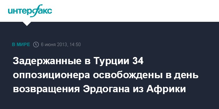 Дубай. 6 июня. INTERFAX.RU - Власти Турции освободили более 30 активистов, задержанных в минувшую среду в Измире за критикующие правительство публикации в Twitter, сообщил в четверг межарабский канал "Аль-Джазира". В общей сложности на свободу вышли 34 оппозиционера.