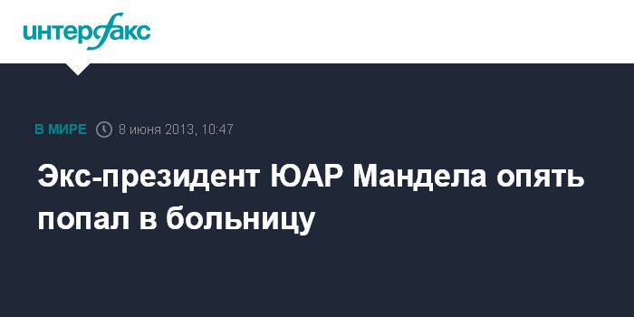 Вашингтон. 8 июня. INTERFAX.RU - Экс-президент ЮАР Нельсон Мандела в очередной раз госпитализирован с обострением легочной инфекции, сообщил в субботу американский канал CNN. 94-летний Н.Мандела находится в больнице в Претории. По словам врачей, он находится в стабильном состоянии.
