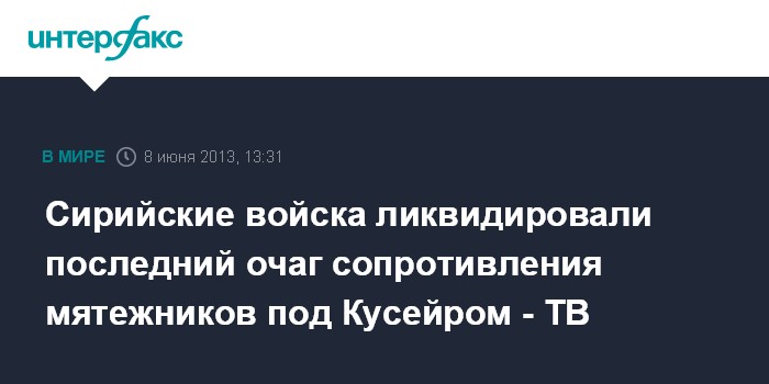 Бейрут. 8 июня. INTERFAX.RU - Сирийские правительственные войска подавили последний очаг сопротивления оппозиции у города Кусейр, сообщило в субботу сирийское государственное телевидение.