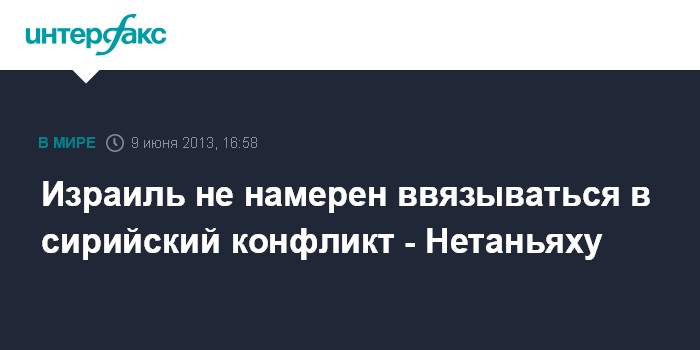 Иерусалим. 9 июня. INTERFAX.RU - Премьер-министр Израиля Биньямин Нетаньяху заявил, что его страна не будет ввязываться в конфликт в Сирии, несмотря на напряженную ситуацию в районе Голанских высот. "Израиль не будет вовлечен в гражданскую войну в Сирии до тех пор, пока огонь не будет применен против нас", - подчеркнул Б.Нетаньяху в воскресенье в ходе заседания правительства.