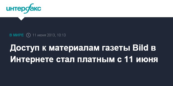 Берлин. 11 июня. INTERFAX.RU - Самая тиражная немецкая газета Bild с 11 июня сделала платным доступ к большинству своих материалов в Интернете. Только новости на сайте можно будет прочесть бесплатно, а вот за эксклюзивные статьи, интервью, фоторепортажи, аналитику и комментарии придется платить.