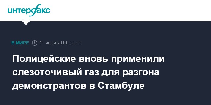 Вашингтон. 11 июня. INTERFAX.RU - Турецкая полиция была вынуждена вновь применить слезоточивый газ и водометы для разгона протестующих на площади Таксим в Стамбуле, сообщает CNN. Ранее сообщалось, что бойцы турецкого полицейского спецназа установили контроль над площадью Таксим, близ которой находится парк Гези.