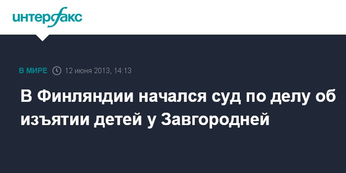 Хельсинки, 12 июня. INTERFAX.RU - Хельсинкский городской суд приступил в среду к рассмотрению дела об изъятии четырех детей у гражданки РФ Анастасии Завгородней. "Процесс проходит строго конфиденциально, даже Завгороднюю не пустили в зал суда, чтобы отстаивать там интересы детей", - сообщил "Интерфаксу" финский правозащитник Йохан Бекман.
