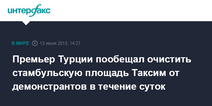 Стамбул. 13 июня. INTERFAX.RU - Полиция очистит площадь Таксим от демонстрантов в течение ближайших 24 часов, заявил в четверг премьер-министр Турции Реджеп Тайип Эрдоган.