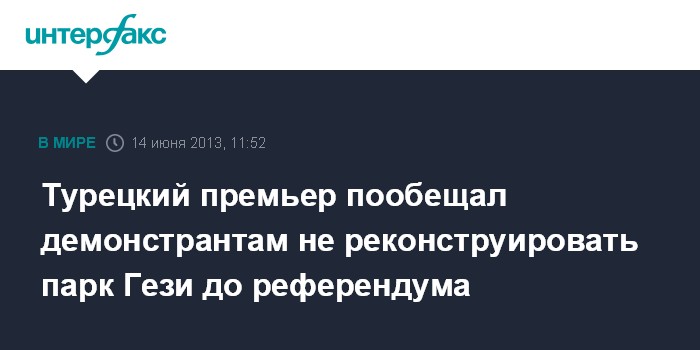 Представители движения "Солидарность с Таксимом" сообщили, что Эрдоган обязался повиноваться решению суда, который рассматривает жалобу на планы правительства по сносу парка Гези в центре Стамбула, и если он примет решение в пользу властей, этот вопрос будет вынесен на всеобщий референдум.