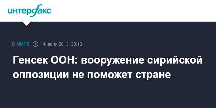 Нью-Йорк (ООН).14 июня. INTERFAX.RU - Генеральный секретарь ООН Пан Ги Мун полагает, что поставка вооружения в Сирию, в том числе сирийской оппозиции, не приведет к урегулированию кризиса.