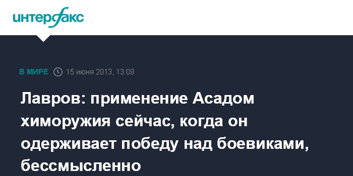Москва. 15 июня. INTERFAX.RU - Глава МИД РФ Сергей Лавров считает бесмысленным использование химоружия режимом Башара Асада в тот момент, когда он одерживает победу над вооруженной оппозицией.