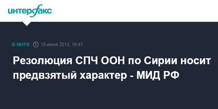 Москва. 15 июня. INTERFAX.RU - Резолюция Совета ООН по правам человека (СПЧ) по Сирии, принятая 14 июня, предвзятая, заявляют в МИД России. "Резолюция носит предвзятый, контрпродуктивный характер. Она направлена против правительства Сирии и игнорирует преступления, совершаемые радикальной оппозицией. В тексте осуждается вовлеченность в конфликт "Хизбаллы". При этом авторов не беспокоит, что в стране воюют тысячи обученных, вооруженных и щедро оплаченных из-за рубежа наемников-террористов", - говорится в сообщении, опубликованном на сайте МИД РФ.