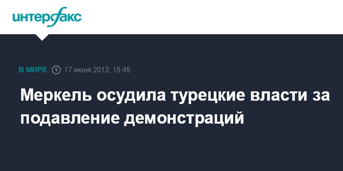 Берлин. 17 июня. INTERFAX.RU - Канцлер Германии Ангела Меркель заявила в понедельник, что потрясена жестким ответом властей Турции на антиправительственные выступления.