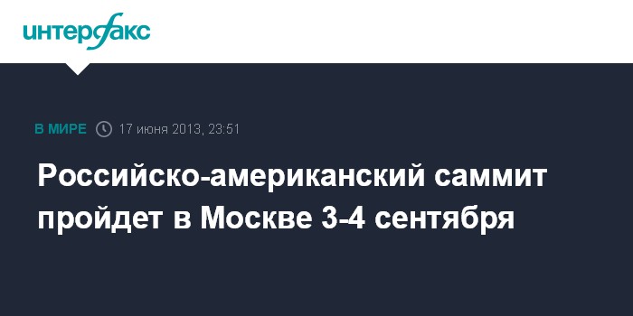 "Для закрепления конструктивного характера наших отношений мы намерены поддерживать регулярные контакты на высшем уровне и провести российско-американский саммит в Москве 3-4 сентября 2013 г., чтобы более детально обсудить весь спектр двусторонних и международных отношений", - говорится в совместном заявлении президентов России и США, подписанном по итогам встречи Путина и Обамы в Лох-Эрне на полях саммита G-8.