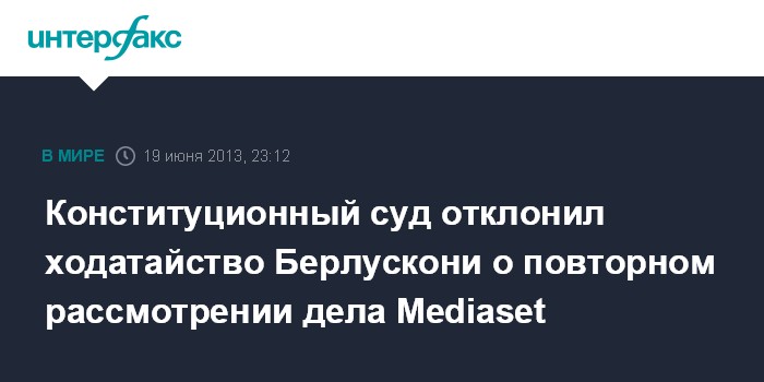 Рим. 19 июня. INTERFAX.RU - Конституционный суд Италии в среду отклонил ходатайство адвокатов бывшего премьер-министра Италии Сильвио Берлускони о повторном рассмотрении дела Mediaset в суде первой инстанции, пишет итальянская газета Corriere della Sera.