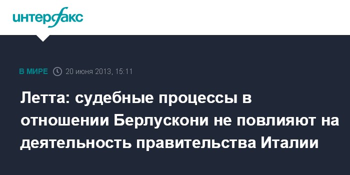 Рим. 20 июня. INTERFAX.RU - Рассмотрение в итальянских судах дел, фигурантом которых является экс-премьер страны Сильвио Берлускони, вряд ли приведет к падению коалиционного правительства страны, заявил в четверг председатель Совета министров Италии Энрико Летта.