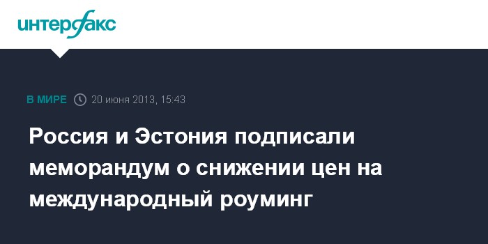 Москва. 20 июня. INTERFAX.RU - Минкомсвязи России и министерство экономики и коммуникаций Эстонии в четверг подписали меморандум о снижении действующих тарифов на международный роуминг, говорится в сообщении Минкомсвязи. Документ был подписан в рамках Петербургского международного экономического форума.