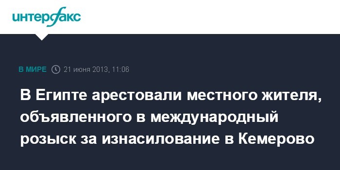 Кемерово. 21 июня. INTERFAX.RU - По информации Интерпола, в Египте задержан обвиняемый в изнасиловании на территории Кемеровской области, сообщил агентству "Интерфакс" сотрудник пресс-службы регионального главка МВД Владимир Сергеев.