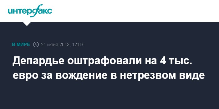 Париж. 21 июня. INTERFAX.RU - Исправительный суд Парижа приговорил французского актера Жерара Депардье к штрафу в размере 4 тыс. евро и лишению водительских прав сроком на шесть месяцев за вождение в нетрезвом виде, пишет в пятницу местная газета Le Figaro.