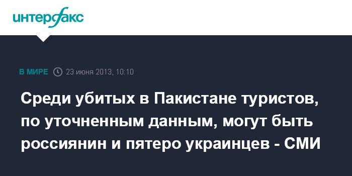 Лондон. 23 июня. INTERFAX.RU - В результате атаки боевиков на гостиницу на севере пакистанского Кашмира погибли, по предварительным уточненным данным, один гражданин России, пять - Украины и трое - КНР, сообщает британская телерадиокорпорация BBC. В результате нападения погибла также гражданка Пакистана.