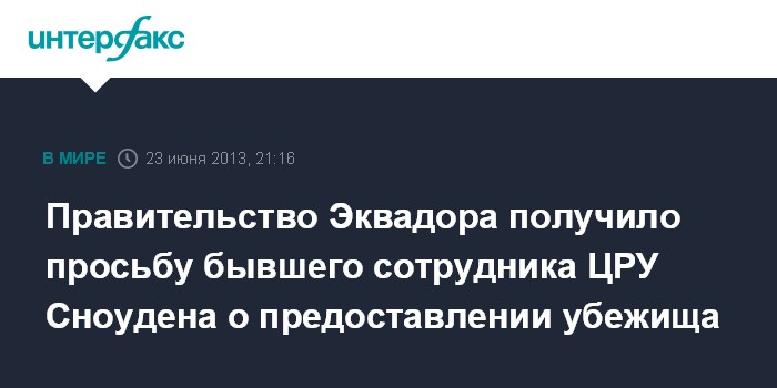 Кито. 23 июня. ИНТЕРФАКС - Бывший сотрудник ЦРУ Эдвард Сноуден обратился к властям Эквадора с просьбой о политическом убежище.
