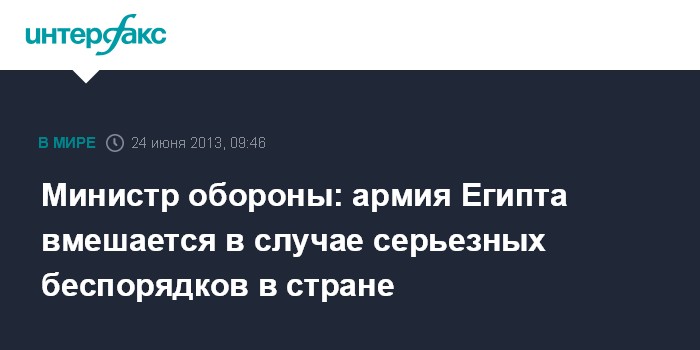 Каир. 24 июня. INTERFAX.RU - Вооруженные силы Египта должны быть готовы вмешаться в случае возникновения серьезных беспорядков в стране, заявил министр обороны Абдель Фатах ас-Сисси, выступая перед военнослужащими.
