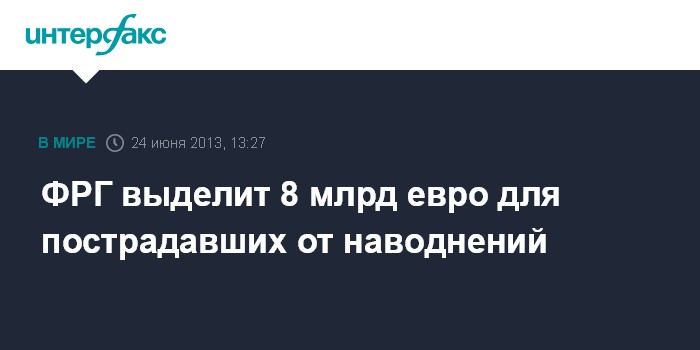 Берлин. 24 июня. INTERFAX.RU - Совет министров Германии одобрил проект, предусматривающий выделение 8 млрд евро для оказания помощи пострадавшим в результате наводнения, сообщает агентство EFE.
