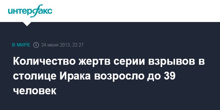 Багдад. 24 июня. INTERFAX.RU - По меньшей мере, 39 человек погибли в результате взрывов семи бомб в столице Ирака Багдаде, еще более 60 получили ранения, сообщили в понедельник журналистам местные полицейские и медики.
