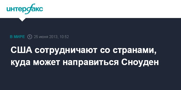 Вашингтон. 25 июня. INTERFAX.RU - Власти США тесно взаимодействуют со странами, куда может отправиться в поиске политического убежища бывший агент ЦРУ Эдвард Сноуден. "США сотрудничают по дипломатическим каналам с рядом стран, в которые он (Сноуден - ИФ) может отправиться", - сказал представитель госдепа США Патрик Вентрелл на брифинге в понедельник.