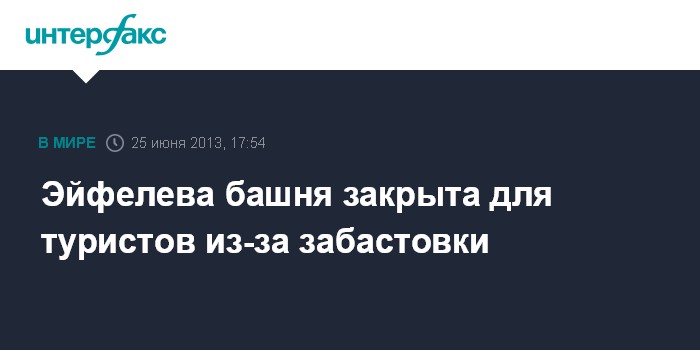Москва. 25 июня. INTERFAX.RU - Эйфелева башня в Париже закрыта во вторник для туристов из-за забастовки обслуживающего персонала, сообщает газета Liberation.