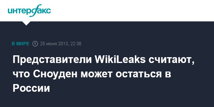 Вашингтон. 25 июня. INTERFAX.RU - Бывший сотрудник ЦРУ Эдвард Сноуден может навсегда остаться в России из-за угроз со стороны Вашингтона, говорится в заявлении представителей сайта WikiLeaks. "Аннулирование паспорта Сноудена и запугивание стран-посредников (с помощью которых он может найти убежище - ИФ) могут задержать его в России навсегда", - гласит заявление, опубликованное на странице организации в "твиттере".