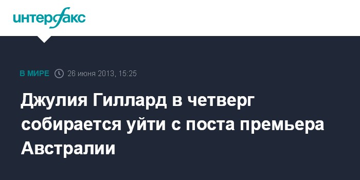 Сидней. 26 июня. INTERFAX.RU - Премьер-министр Австралии Джулия Гиллард собирается в четверг объявить об уходе в отставку, сообщает местное телевидение.