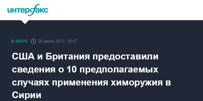Нью-Йорк (ООН). 26 июня. INTERFAX.RU - Власти США и Великобритании представили на рассмотрение экспертов ООН подробный отчет о 10 предполагаемых случаях применения химического оружия правительственными военными Сирии против бойцов оппозиционных сил.