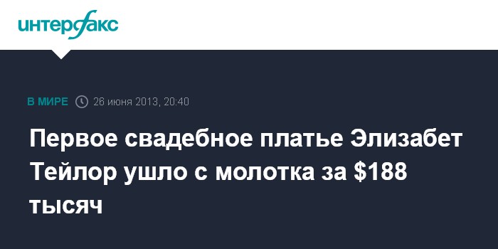 Лондон. 26 июня. INTERFAX.RU - Свадебное платье, которое американская актриса Элизабет Тейлор надела на церемонию бракосочетания с первым мужем Конрадом "Ники" Хилтоном, было продано на аукционе Christie's в британской столице за $188 тыс., сообщают в среду представители аукционного дома.