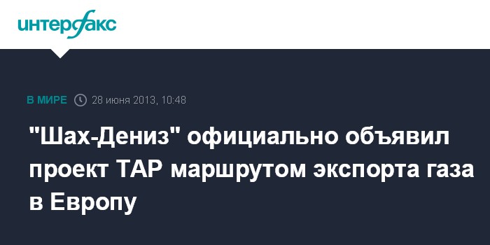 Баку. 28 июня. INTERFAX.RU - Консорциум "Шах-дениз" в официально объявил проект строительства Транс-Адриатического газопровода (Trans Adriatic Pipeline, TAP) маршрутом для экспорта газа со Стадии-2 разработки месторождения Шах-Дениз в Европу, сообщил в пятницу на пресс-конференции региональный президент компании BP в Азербайджане, Грузии и Турции Гордон Биррелл.
