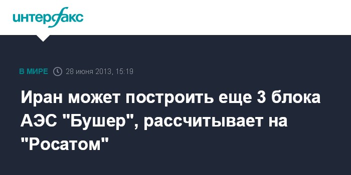 Санкт-Петербург. 28 июня. INTERFAX.RU - Иран планирует построить еще три блока на АЭС "Бушер", рассчитывает на расширение сотрудничества с российской госкорпорацией "Росатом", сообщил глава Организации по атомной энергии Ирана Ферейдун Аббаси-Давани журналистам в пятницу в Санкт-Петербурге.