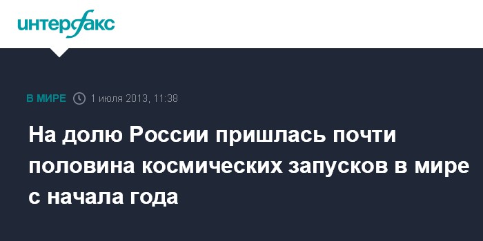 Москва. 1 июля. NTERFAX.RU - Россия в первой половине 2013 года осуществила почти половину мировых пусков ракет космического назначения.