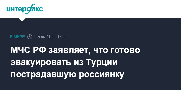 Москва. 1 июля. INTERFAX.RU - МЧС России не получало запросов об эвакуации из Турции 14-летней россиянки, получившей на отдыхе тяжелые травмы, но готово направить самолет в случае его поступления и соответствующего решения врачей, заявила журналистам официальный представитель МЧС России Ирина Россиус.