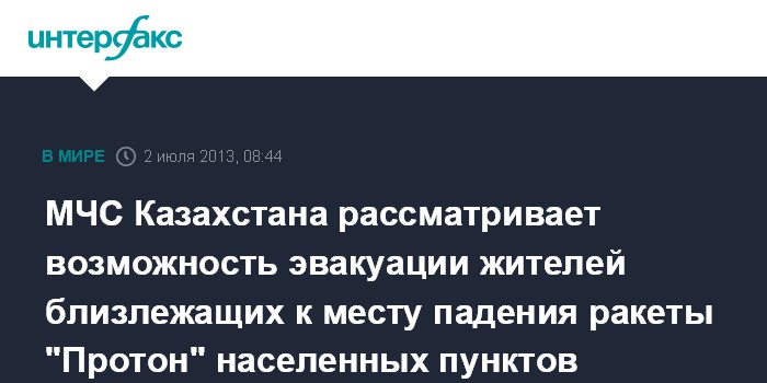 Астана. 2 июля. INTERFAX.RU - Жертв и пострадавших в результате падения ракеты-носителя "Протон" во вторник на космодроме Байконур нет, сообщил агентству "Интерфакс-Казахстан" источник в правоохранительных органах.