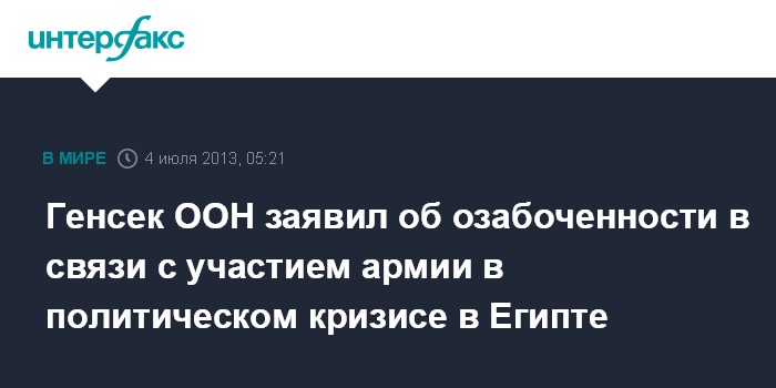Нью-Йорк (ООН). 4 июля. ИНТЕРФАКС - Генеральный секретарь ООН Пан Ги Мун выразил озабоченность тем, что армия вмешалась в политические процессы в Египте.