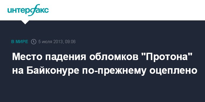Байконур. 5 июля. INTERFAX.RU - Место падения обломков ракеты-носителя "Протон-М" на Байконуре по-прежнему оцеплено сотрудниками полиции, сообщил в пятницу агентству "Интерфакс" источник на космодроме.