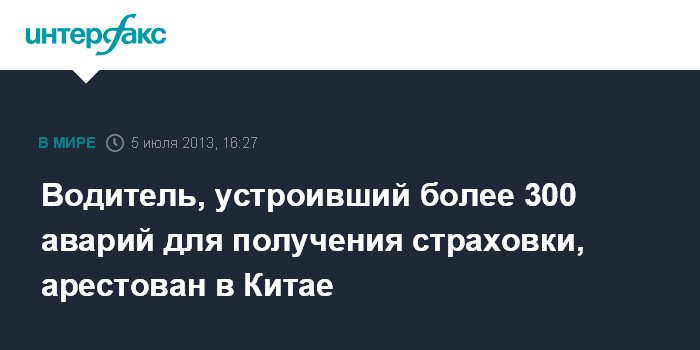 Пекин. 5 июля. INTERFAX.RU – В Китае арестован водитель, совершивший 334 аварии для того, чтобы получать страховые платежи, передают в пятницу китайские СМИ. Таким образом он "заработал" около $58 тыс.